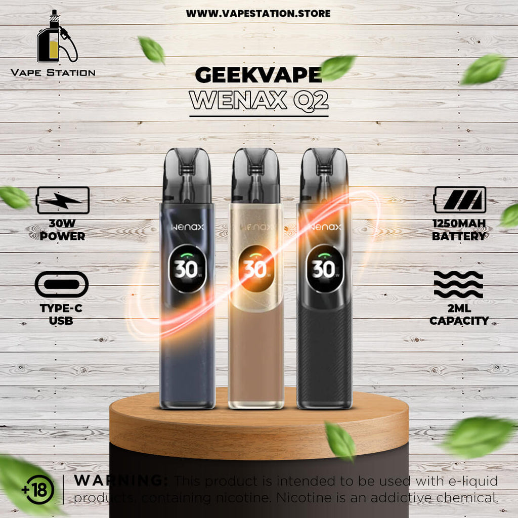 Geekvape Wenax Q 2 Pod Starter Kit 1250mAh. Elevate your daily routine with the Geekvape Wenax Q 2 Pod Kit, a compact open-system device designed for smooth satisfaction and customizable performance. Featuring a long-lasting 1250mAh battery, 30W max output, and fast 5V/2A USB-C charging, this sleek pod system keeps up with your pace from morning to night. Crafted with a fusion of premium materials, the Wenax Q 2 offers a luxurious feel in hand, while its intuitive single-button design lets you effortlessly toggle between power levels, lock settings, and enjoy inhale activation. The vivid UI display adapts to your preferences, making every puff personalized. Paired with Geekvape Q Cartridge (3ml or 2ml TPD), and supporting multiple resistances (0.4Ω, 0.6Ω, 0.8Ω, 1.2Ω), the Wenax Q 2 suits both MTL and RDL experiences with excellent flavor and vapor consistency.