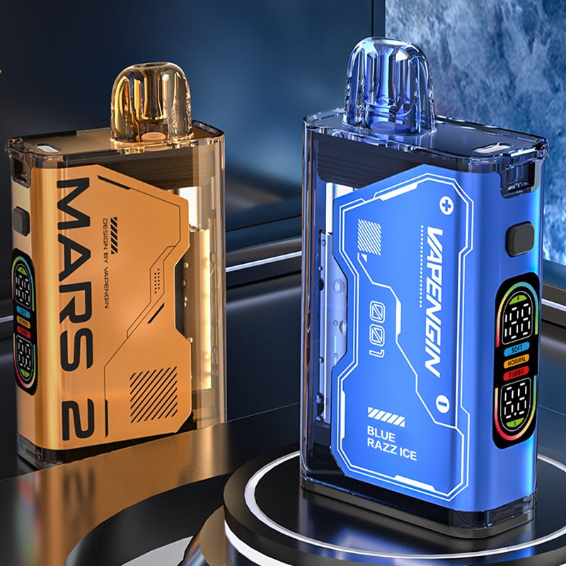 The VAPENGIN Mars 2 Disposable Vape is a futuristic new arrival at Vape station, featuring a cyberpunk see-through design and HD color display showing battery level and vaping time. Powered by a Dual Mesh Coil and advanced e-juice–coil isolation technology, it delivers smooth, consistent flavor with every puff.